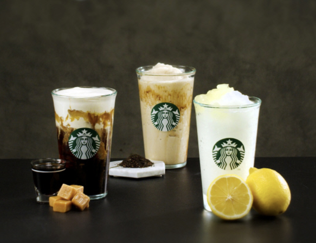 씨솔트 캐러멜 콜드 브루, 스타벅스 클래식 밀크 티 블렌디드, 더블 레몬 블렌디드랍니다.