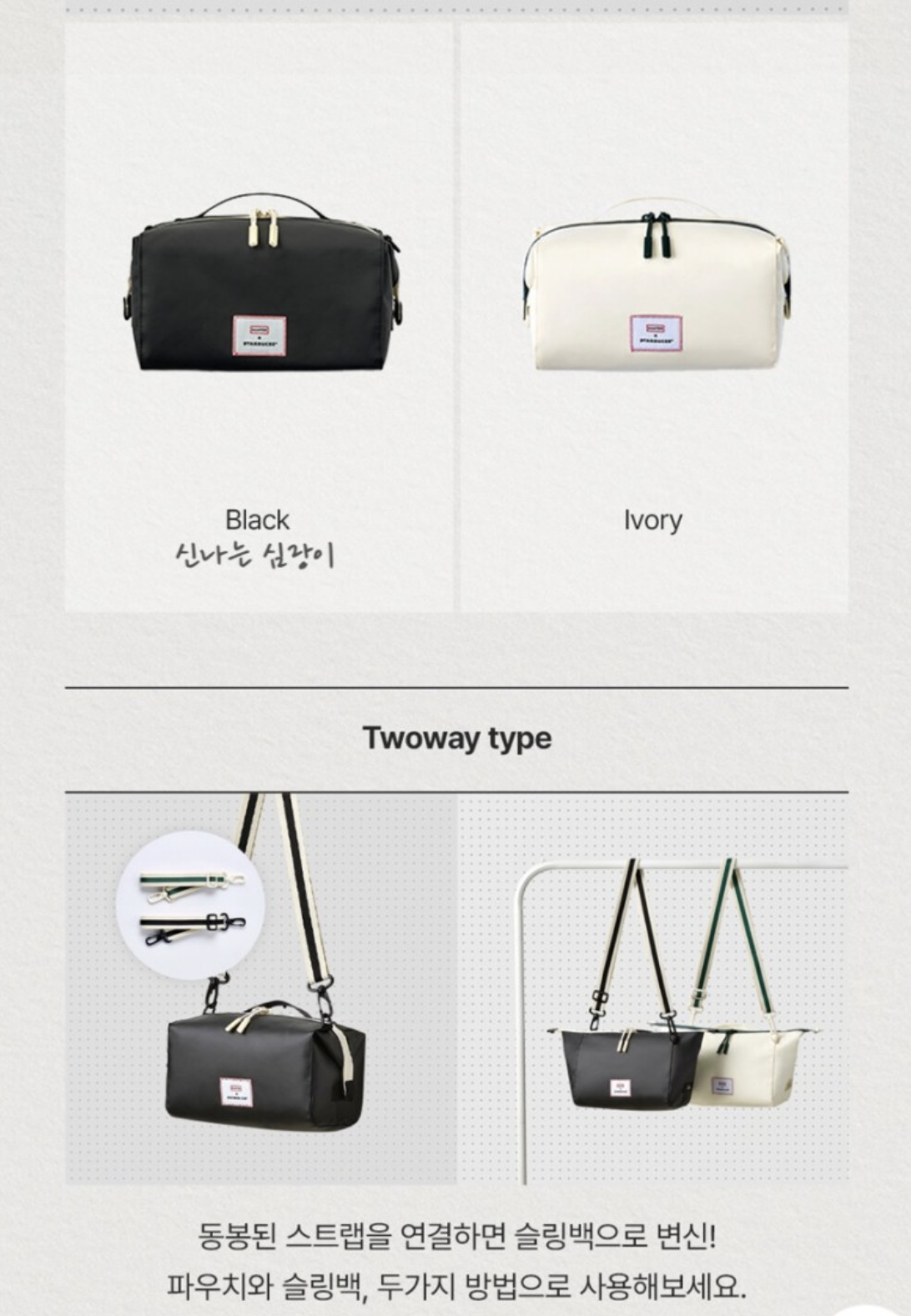 파우치로 사용하거나, 포함된 스트랩을 착용해서 가방으로도 사용할 수 있는 블랙/아이보리 색상의 투웨이 파우치입니다.