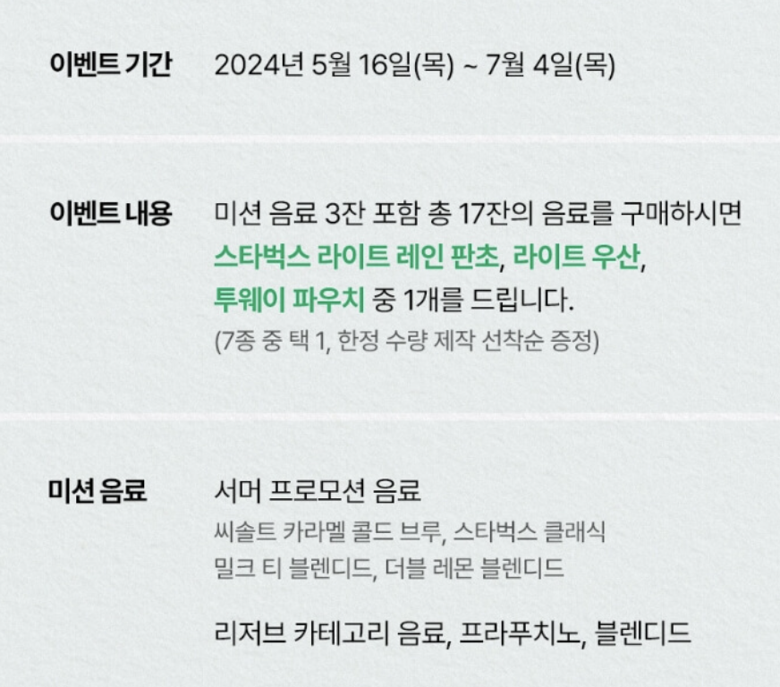 이번 2024 스타벅스 프리퀀시는 헌터와 콜라보한 우비, 판초를 그레이/아이보리 색상 중 1개를 선택 가능할 수 있습니다.